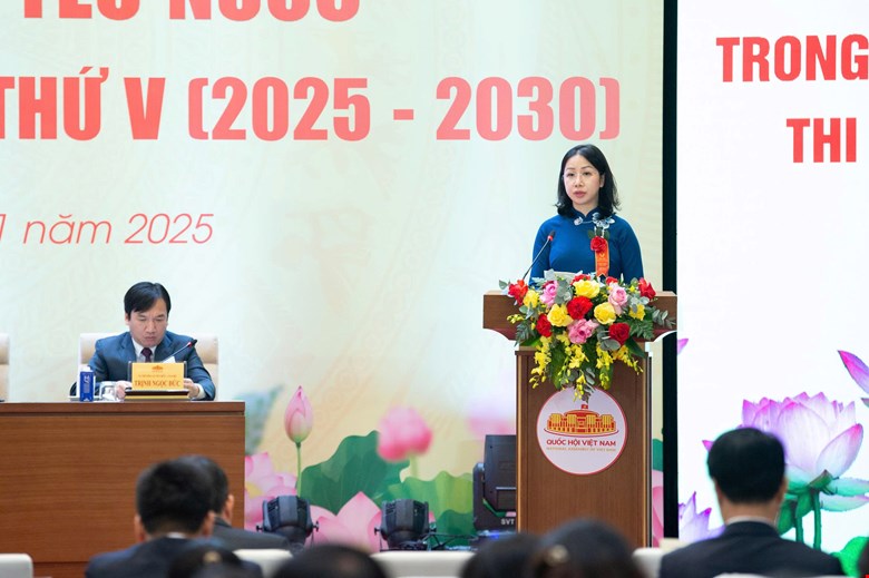 Chủ tịch Hội đồng Dân tộc Y Thanh Hà Niê Kđăm trình bày báo cáo tại phiên họp